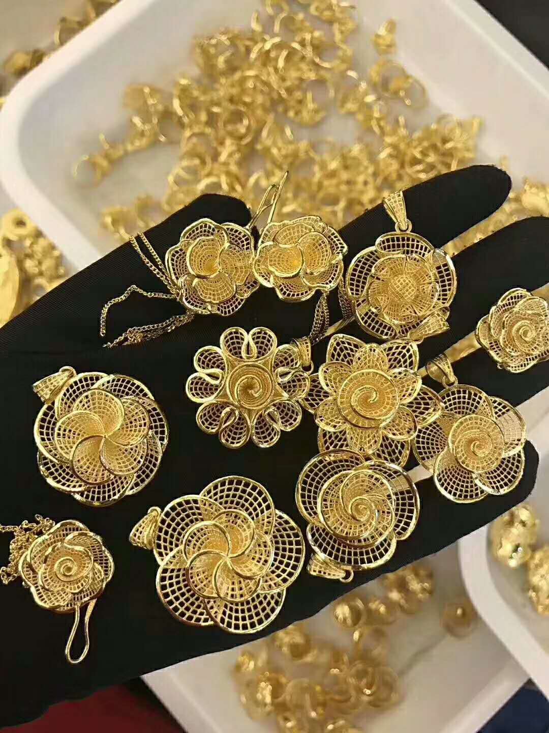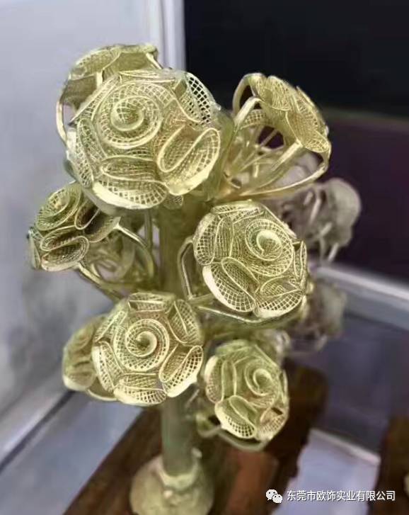 石膏由于收縮作用炸裂后,取出金樹,用鋼刷刷去大塊的石膏,放入30%的氫氟酸中浸泡10分鐘,再夾出,沖洗;用高壓清洗噴槍噴洗金樹,除去剩余的石膏,直至金樹表面干凈,將金樹上的首飾沿水口底部剪下,晾干,稱重即可交付入庫或進行下道工序。